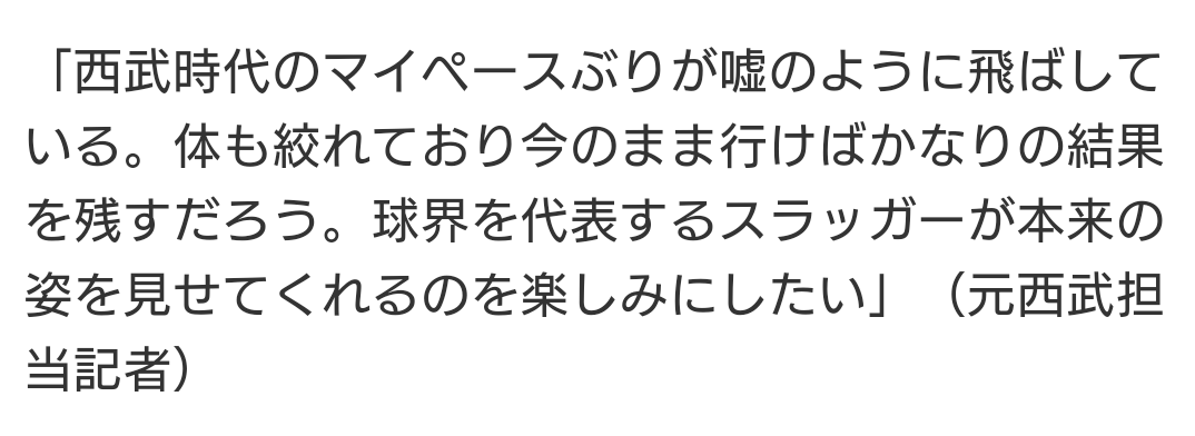 ライオンズ戦で浴びるであろうブーイングに対してどうかはポイントですが、このまま戒めだからと割り切られるとライオンズとしては要注意の打者です。