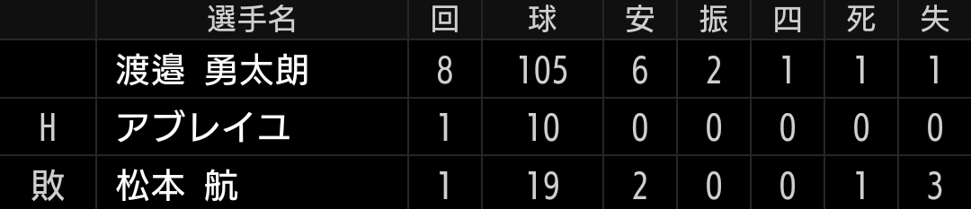 川下3回ー木瀬1回ーシンクレア0.1回ー宮澤1.2回ー粟津1回ー三浦1回ー森脇1回先発の川下投手は、3回2安打1四球1三振無失点です。