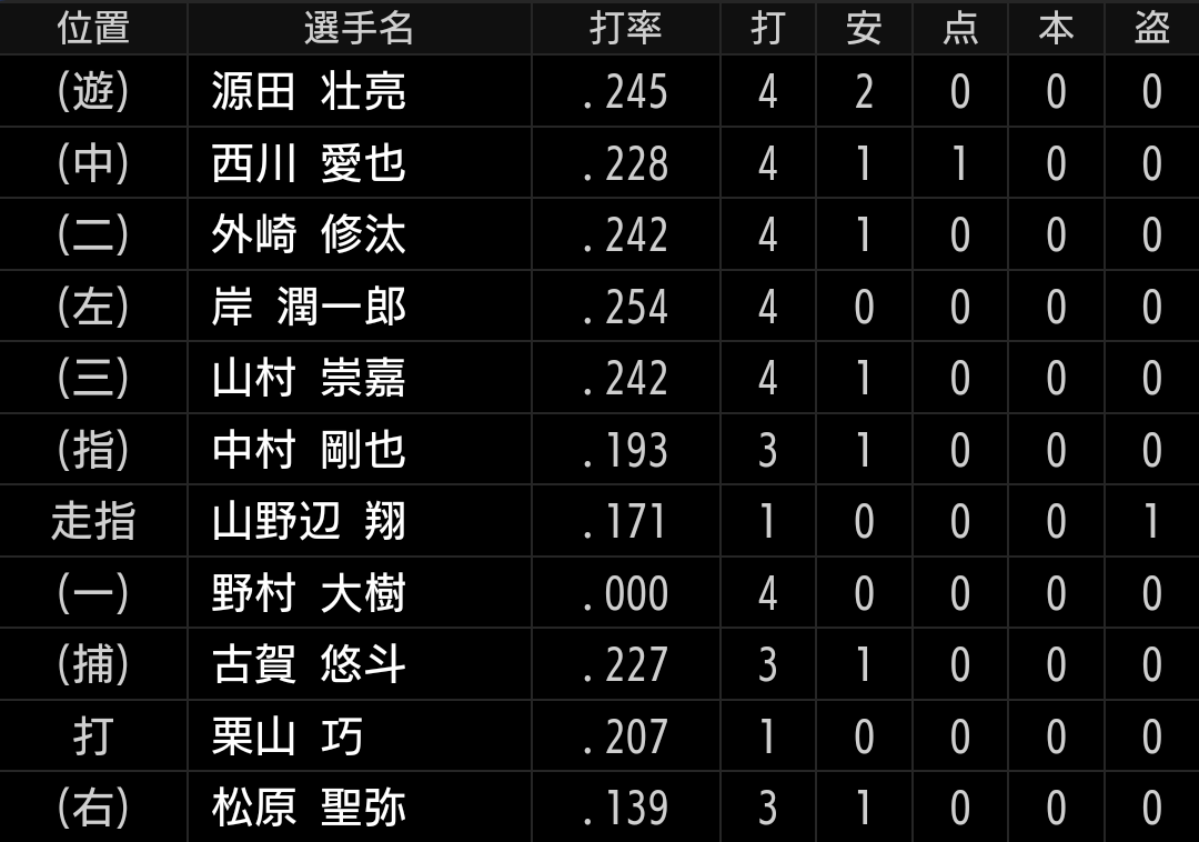 12安打15得点と昨日に続いて大量得点です。仲三河選手が、連日のホームランを含む3安打です。