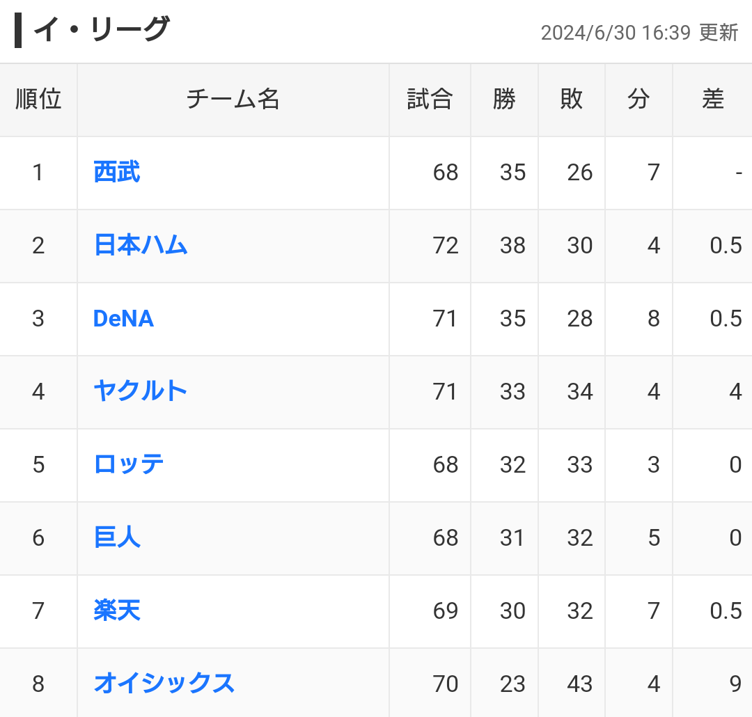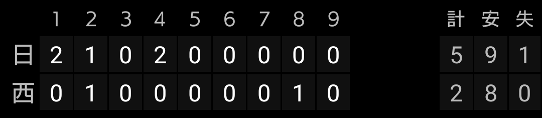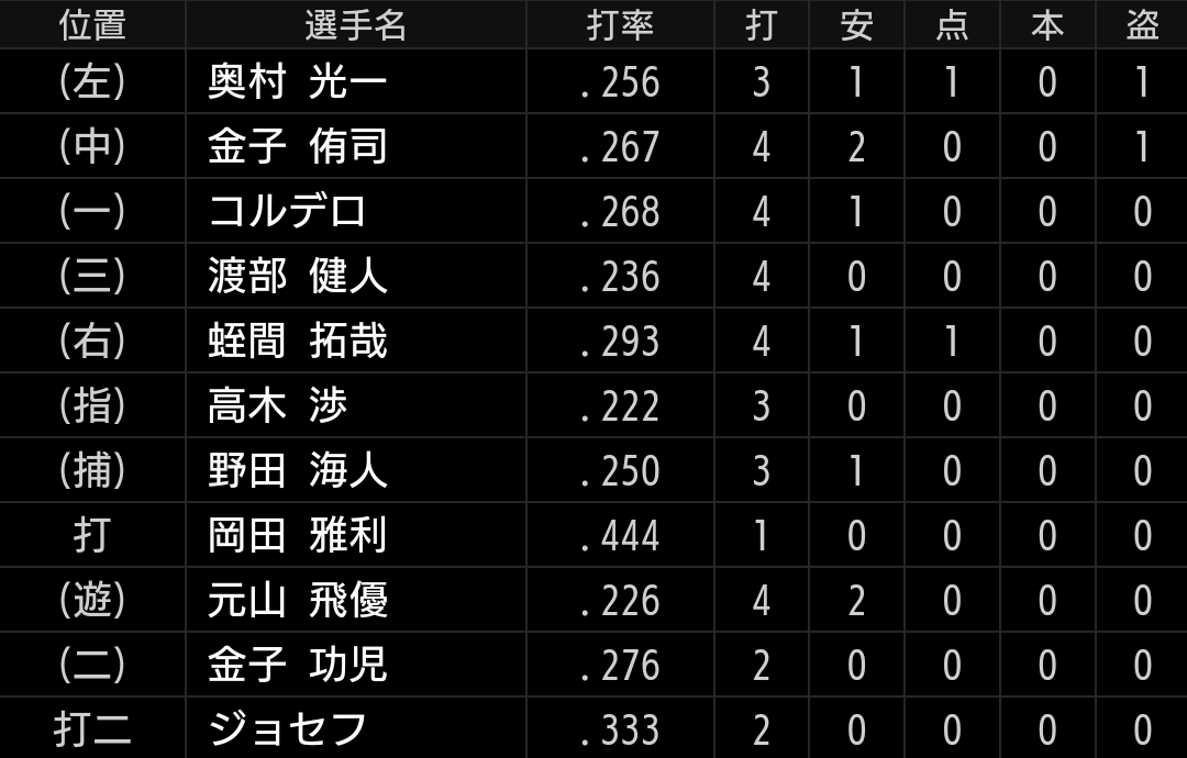 6連勝でイースタン首位に浮上しましたが、敗戦により首位陥落となりました。