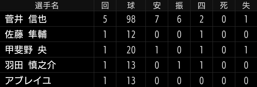 5回5失点と空振りが取れず、打たれて取る状態となりました。武器のスプリットが機能しないとこういう投球になりがちです。