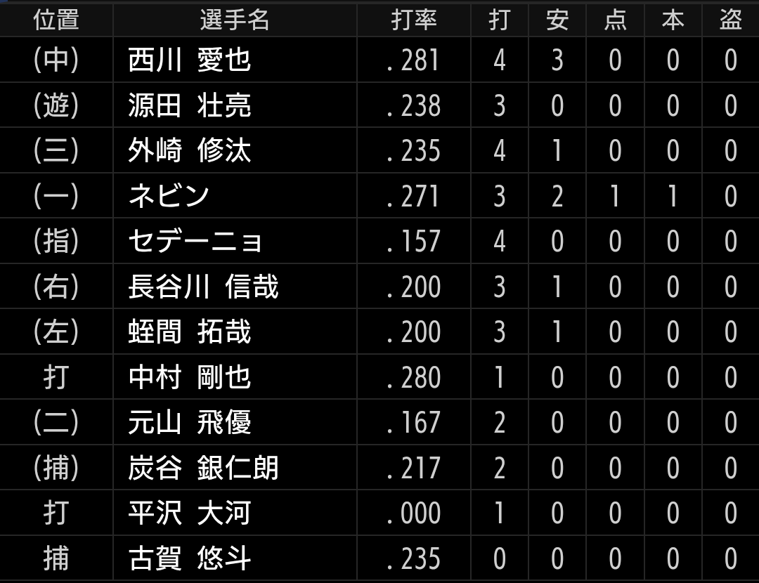 それに、今井、隅田投手は実力で抑えていますし、打線も物足りないものの、西川、渡部聖、ネビン選手と打てる選手を上位に固めているのも良い采配です。