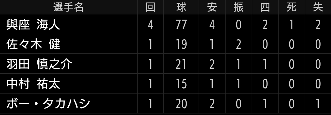 課題の3巡目に入る5回から継投に入りましたが、あまり良くない日でしたし、ブルペンにはロングも出来るボー投手もいますので、與座投手の今日の出来ならこういう継投で良いと思います。