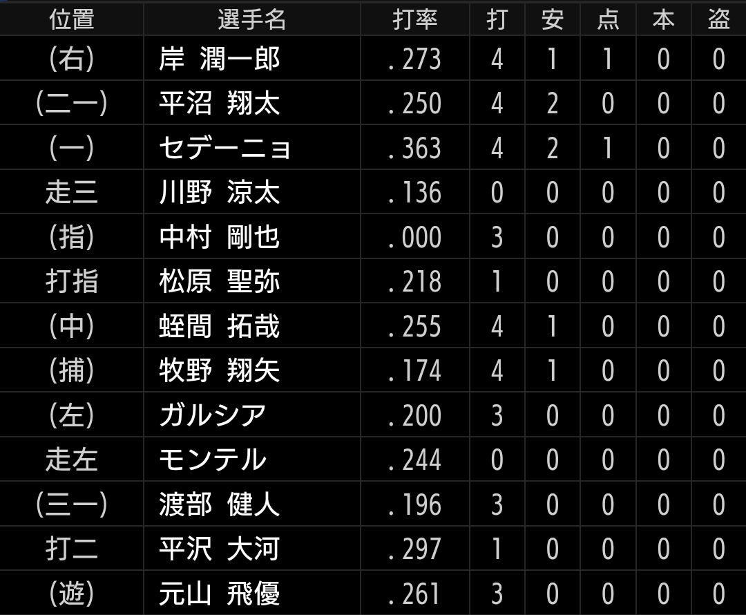 今季の楽天は投手不安のため中継ぎ勝負ならチャンスもあるのですが、その中で唯一リーグトップクラスの投球を見せている西口投手が、よりによってこの回投げていたのはライオンズとしては運もなかったです。