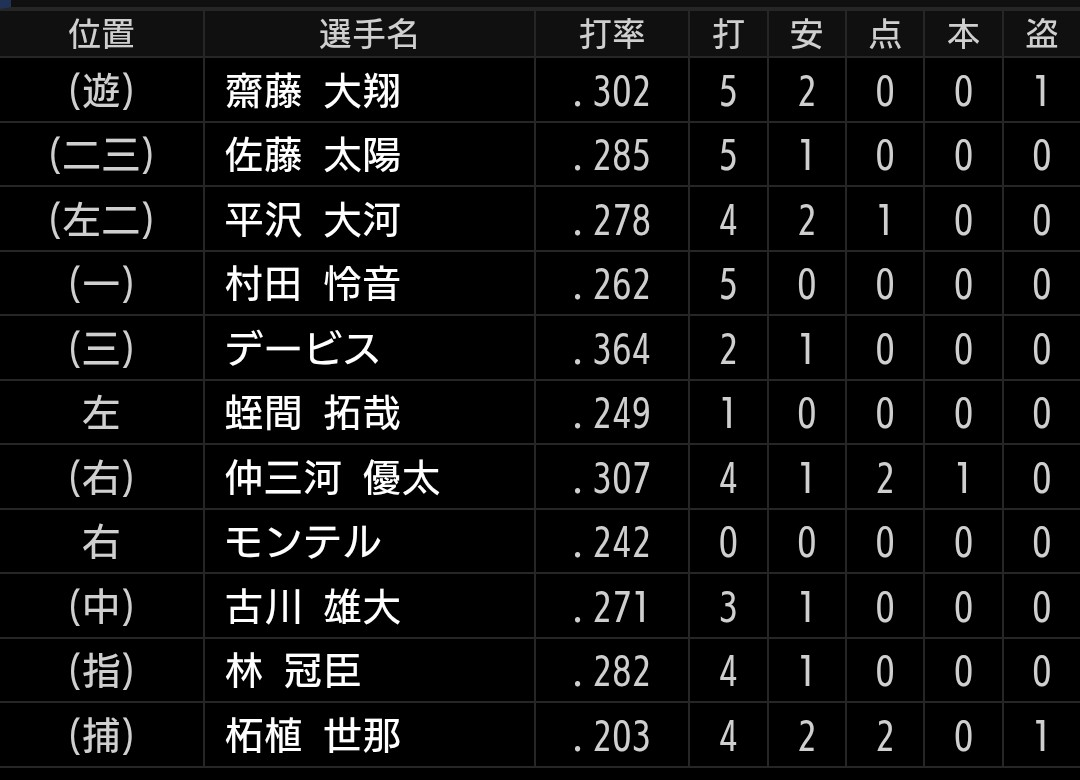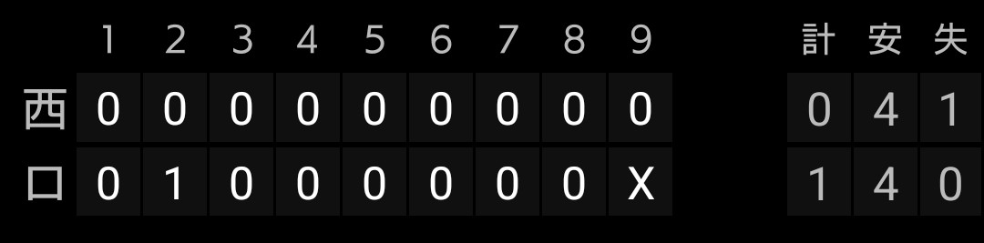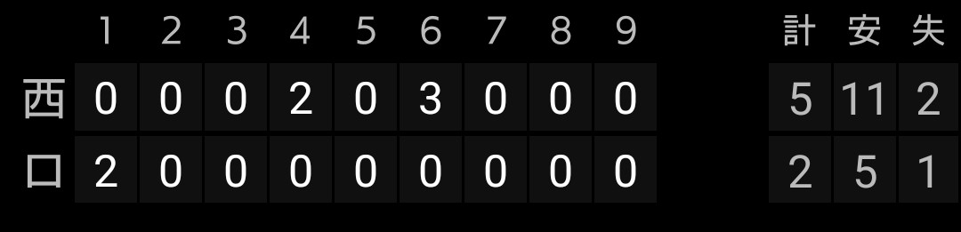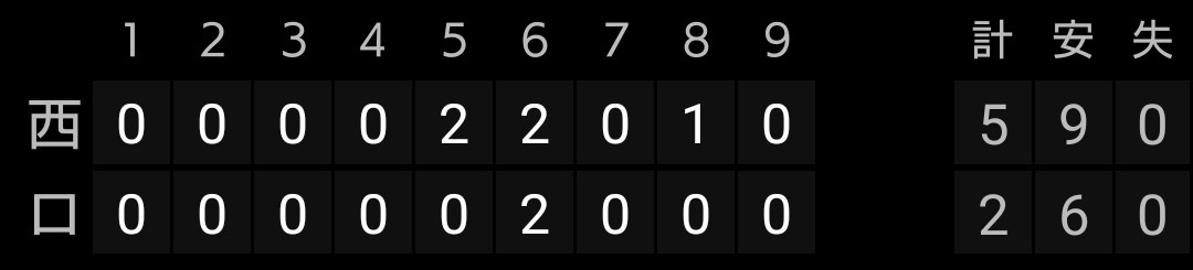 得点は、ガルシア選手タイムリー、バッテリーエラー2つ、古賀、龍山選手タイムリー、相手エラーの7得点です。奥村選手は2安打2四球です。