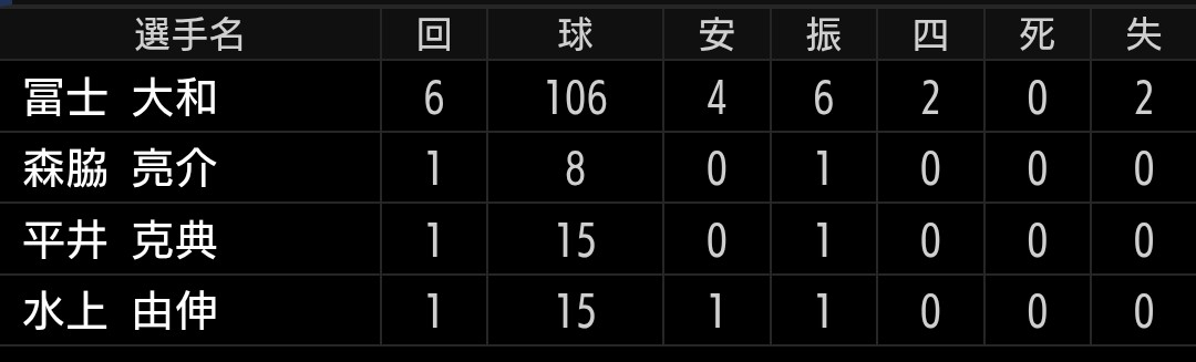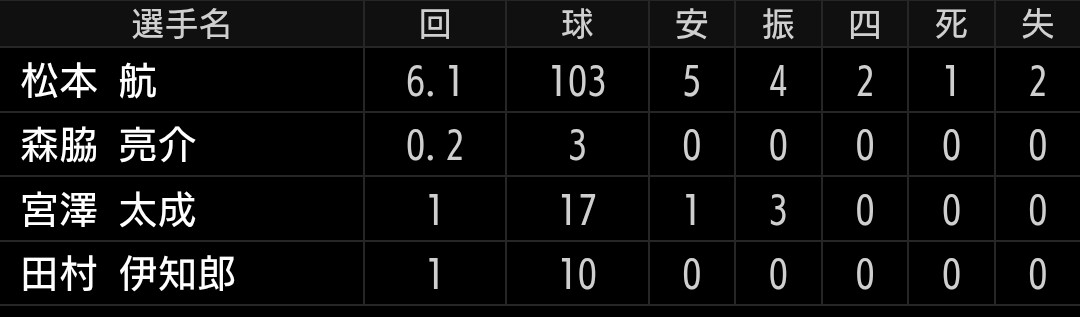 成田 2.1回1安打1三振1四球無失点シンクレア 1.2回2安打無失点