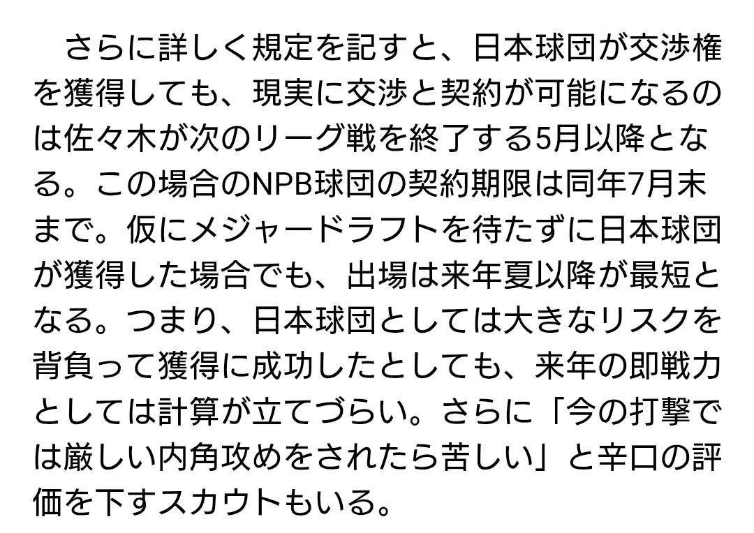 また、日本人大砲はどの球団も欲しいと思いますが、ポジション的に1塁専と言う部分はチーム事情も考えなくてはなりません。