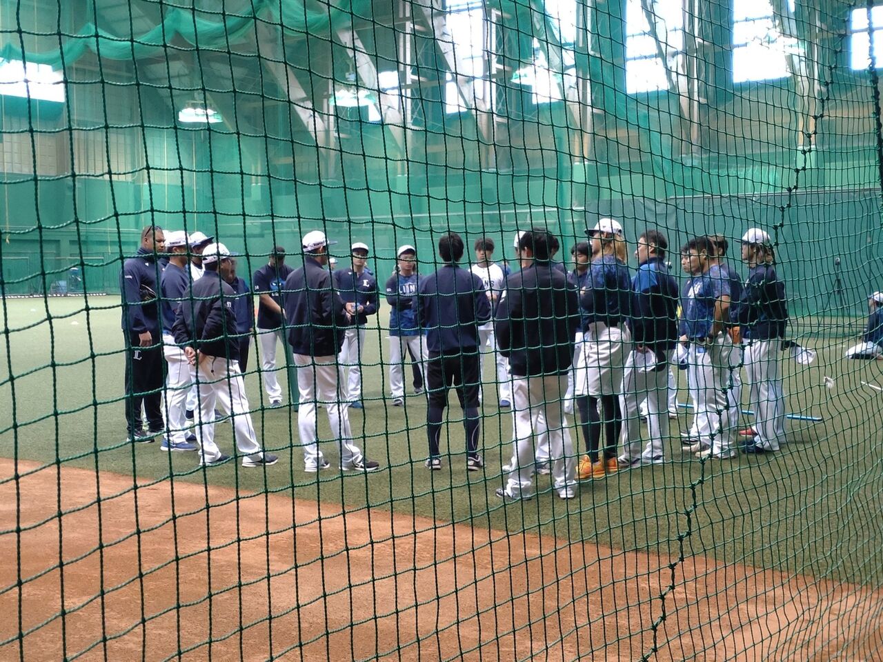 雨のため、和やかなムードの中のキャンプとなっていますが、ライオンズ初のOB戦に向けて渡辺GMも肩を作り始めました。