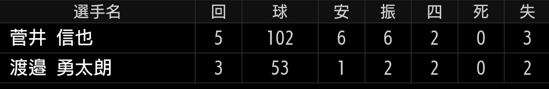 空振りが取れず抜け球もあり、内容的にはイマイチの投球でした。力はある投手だと思いますので、ファーム相手ならイニング数を上回る三振数や、三振>四球となるような投球を見せたいです。