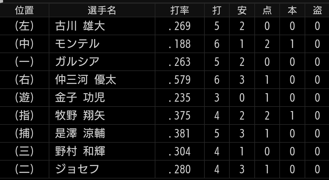 味方守備に加えて自身もエラーをし、この回3つのエラーでサヨナラ負けとなりました。【野手】