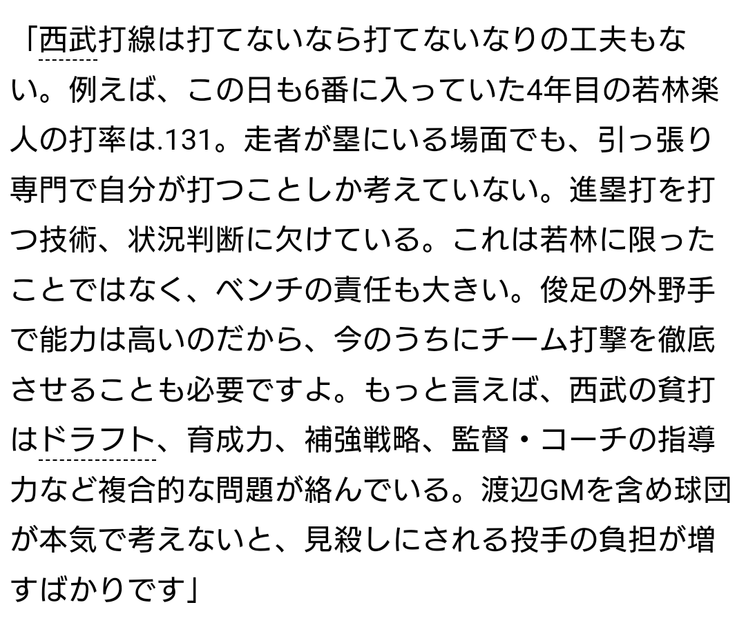ただ、若林選手に関しては打球の強さと言う強みがあります。それを活かすために長打を狙うスタイルにする事は悪くはないです。