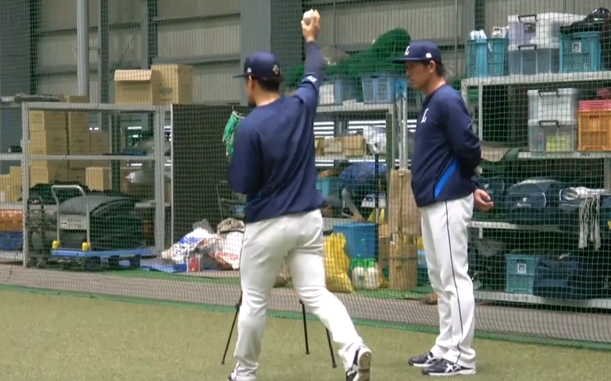 映像でフォームの確認を行う #田村伊知郎 投手。#豊田清 コーチにアドバイスをもらいながら、細かい調整を行いました!