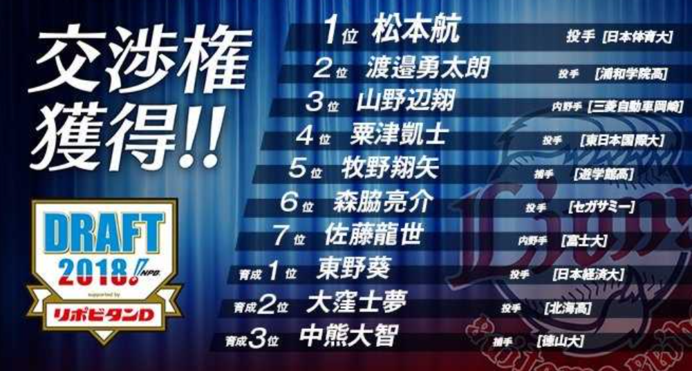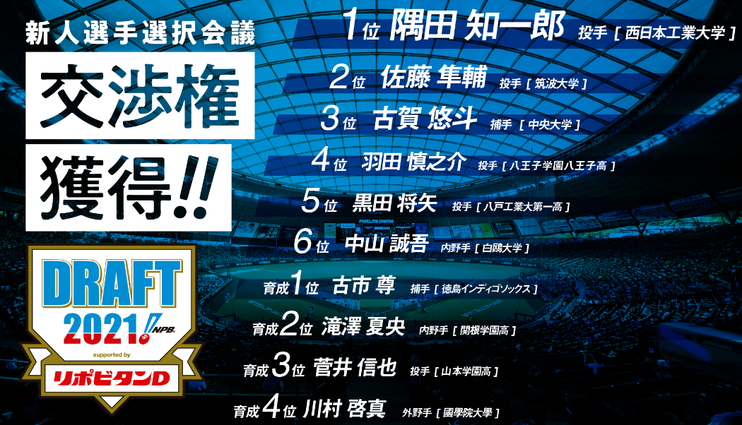 ドラフトは、1位はエースか4番候補か二遊間、それ以降の上位は即戦力、下位は育成込みのポテンシャル重視+足りないポジションを埋める社会人からの即戦力が基本だと思っています。