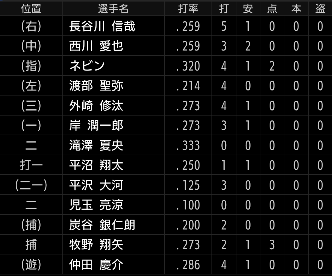 源田、セデーニョのいない打線となりましたが、初回から長谷川、西川選手がチャンスメイクすると、
