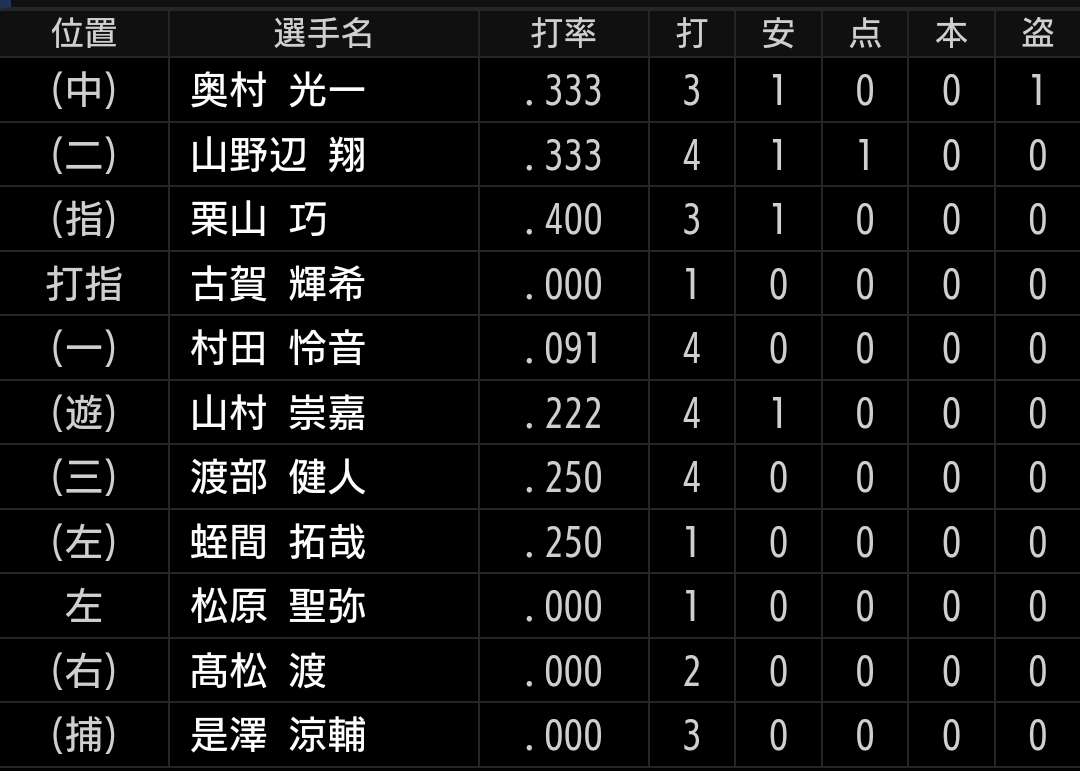 元気のない打線ですが、ファームでは奥村選手の出塁が良く、盗塁でチャンスメイクする形を作れています。