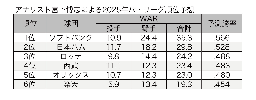 予測得失点差や予測WARでは、4位予想になっています。
