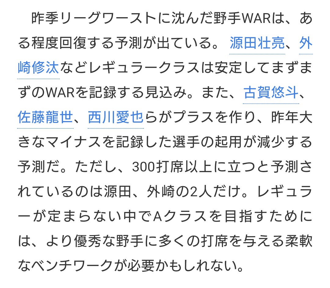 その判断が結果的に、外崎、佐藤龍、野村大選手を同時起用するよりもチームのWARを高くする結果となれば文句ありません。