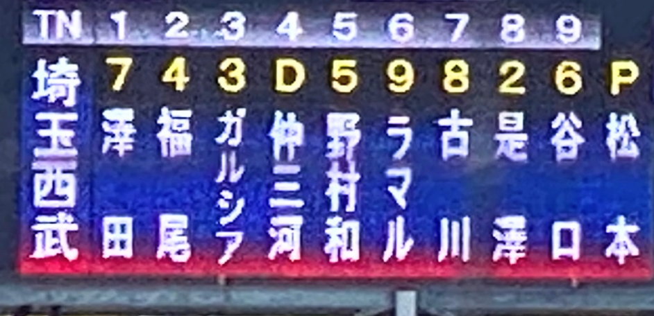 得点は、仲三河選手ホームラン、オケム、福尾、澤田選手タイムリー、是澤選手犠牲フライです。仲三河選手にホームランです。