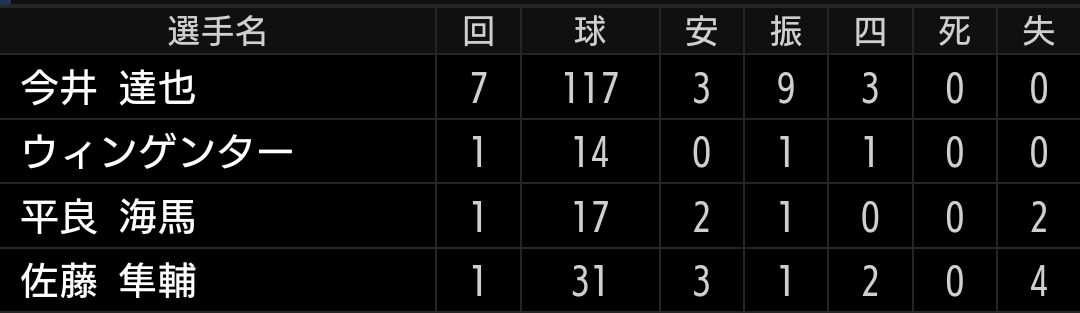ノーアウトでランナーを出しますが、今日は攻守共に散々な古賀悠選手が、この場面は盗塁を刺し切り抜けました。ウィンゲンター投手もその後は、いつも通り三振を奪う投球で抑えています。