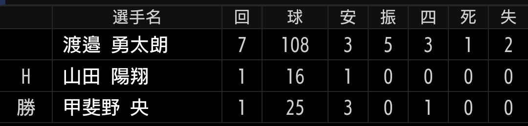 6回までは2安打無失点と踏ん張っていましたが、7回は明らかに疲れも見えホームランで追いつかれました。リリーフがいれば6回まででしたね。