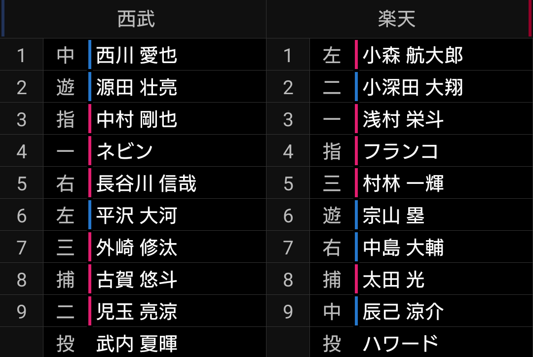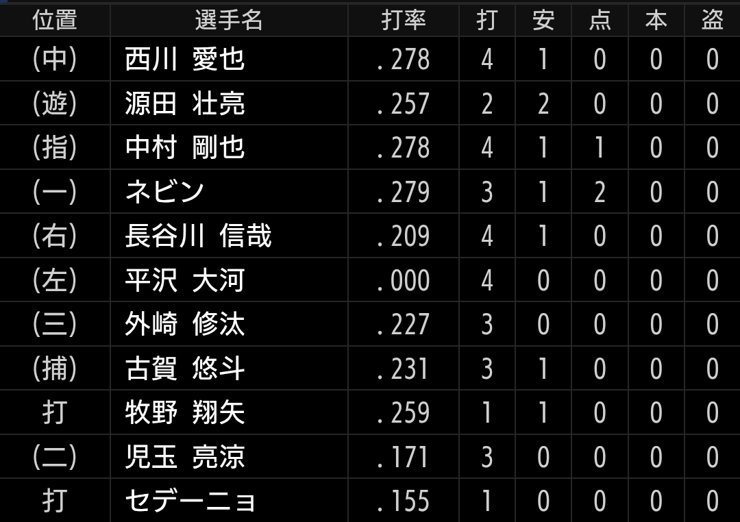 また、好調西川選手とネビン選手の間を繋ぐ源田選手に当たりが出ると、得点の可能性も高まります。