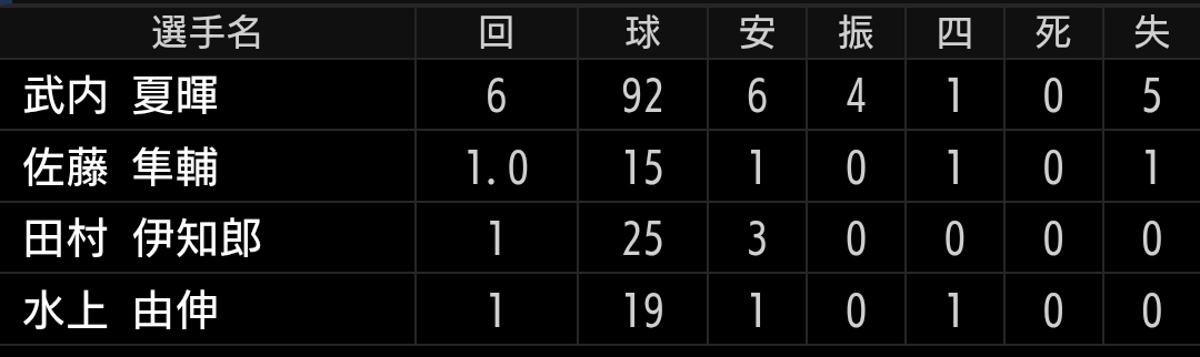 試合を壊しはしませんでしたが、試合を決められる失点です。ただ、武内投手が打たれ出した時点で準備していたのが、佐藤隼、田村投手と敗戦処理投手でしたし、首脳陣の目論見通りと言えばそうなのですが。。。