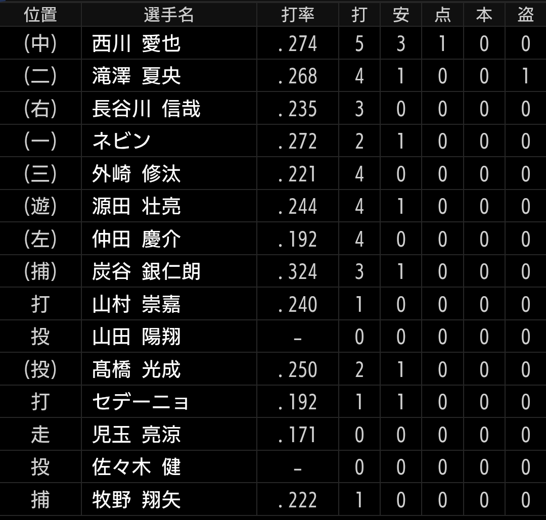 西口監督は捨て試合は割り切る傾向があり、それ自体は悪いとは思いませんが、今日に関しては諦める展開ではありませんでしたので、西口監督には勝ちに行く姿勢を見せてもらいたかったです。