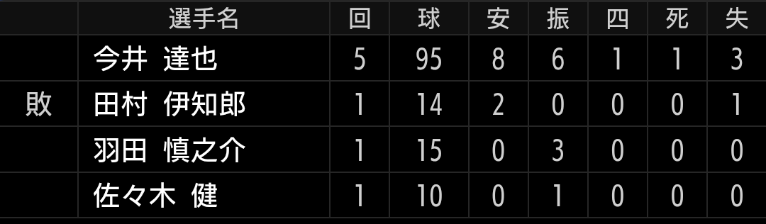 今井投手が本調子ではなかった、引き継いだ田村投手が打たれたではなく、結局は点を取れる時に取らなかったツケを投手陣が払いました。