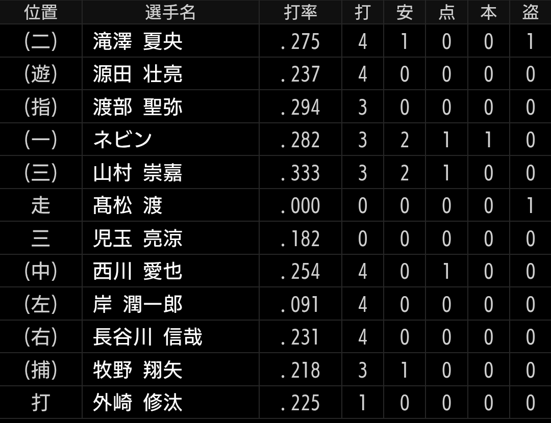 三振した選手もこれは打てん的な感じでしたが、せめてネビン選手のように熱さを見せたり、代打外崎選手のように何とか喰らいつこうとしたり、最後まで諦めない姿勢を出したかったです。