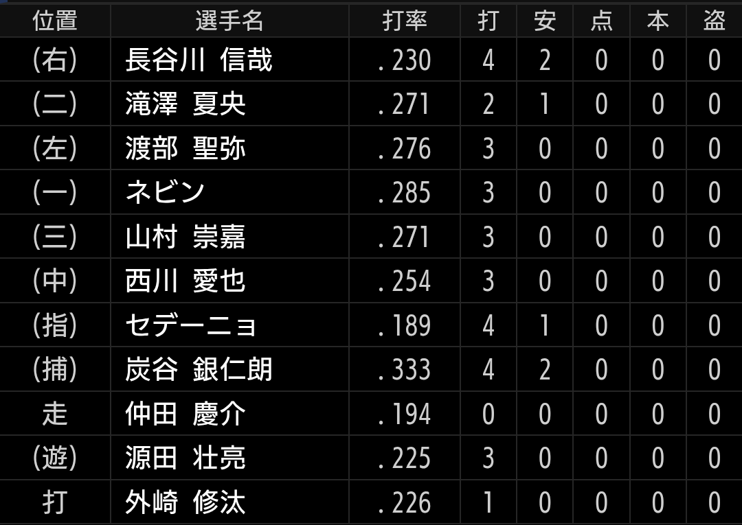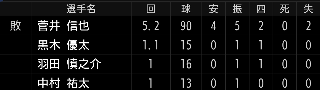 打線がこんな感じなので反撃の期待値は低いですが、それでも可能性を信じられるように、黒木、中村祐投手には同点、ビハインドの場面で無失点に抑える投球を期待したいです。