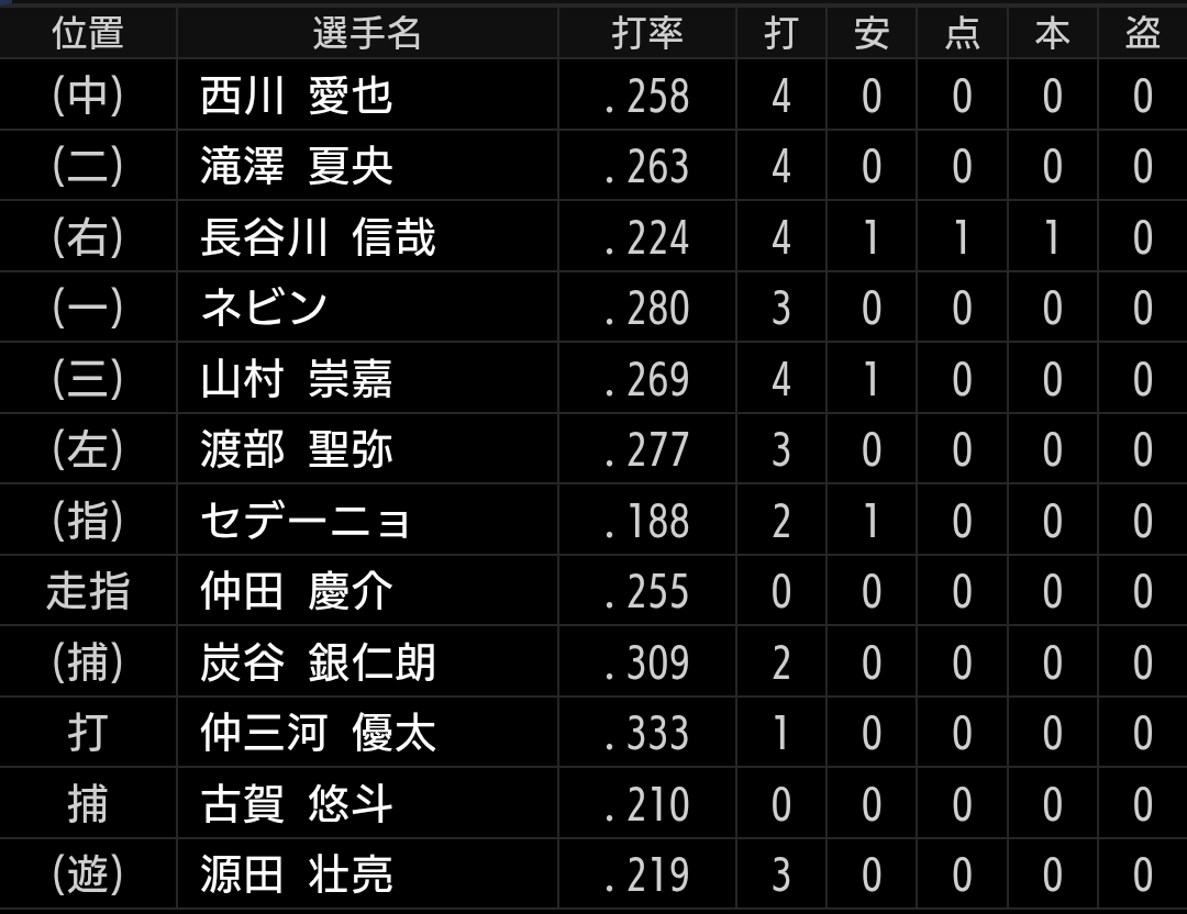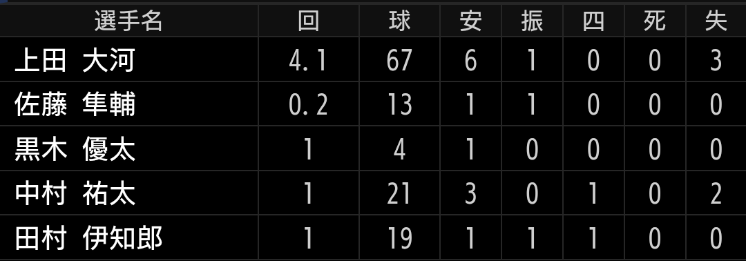 チェンジアップを打たれて2失点です。ファームでは奪三振率も高いのですが、、、勝ちパ以外の中継ぎに不安がありますので、育成から浜屋投手や三浦投手の支配下入りがありそうです。