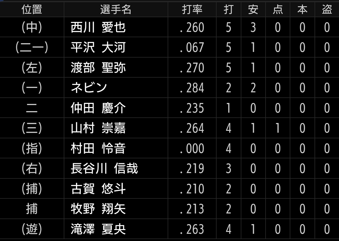 今は打てない事からスタメンで起用されていますが、西川、渡部聖、滝澤、長谷川選手が打ち出すとまた守備型になると思いますので、ここで結果を出してアピールをしてもらいたいです。