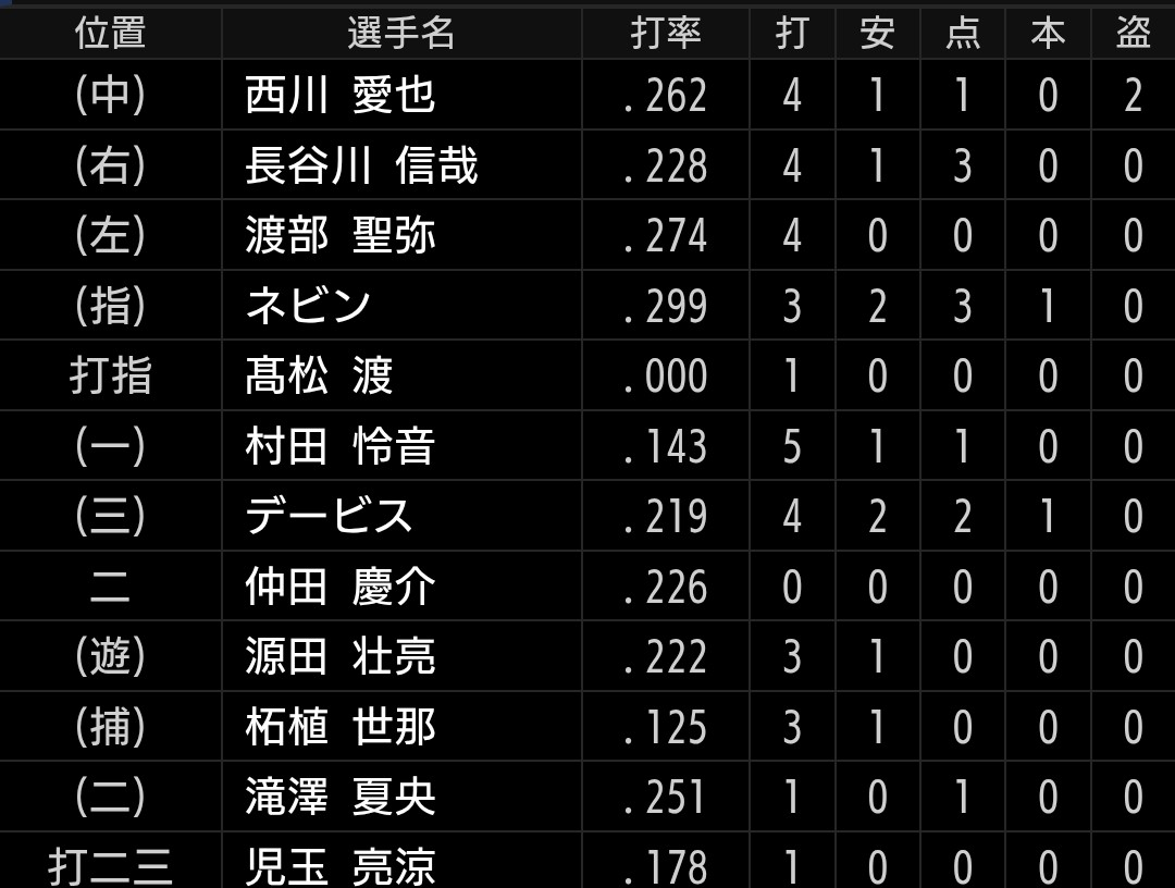 西川選手が出塁しネビン選手が返し、さらに残ったランナーをデービス選手が一掃なんて打線になれば、まだまだ戦えます。