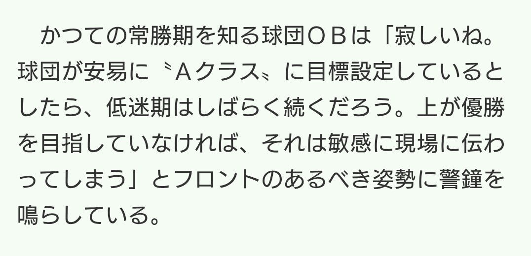 少なくとも球団が、これならワンチャン優勝を目指せるくらいの戦力を整え現場に託す事の出来る体制をいち早く作ってもらいたいです。