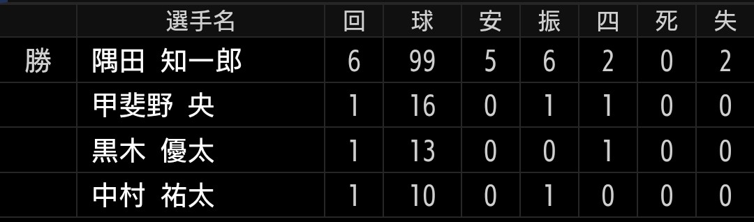 隅田投手も初の二桁勝利となり先発投手としての泊も付きましたし、ライオンズとしては良い試合でした。