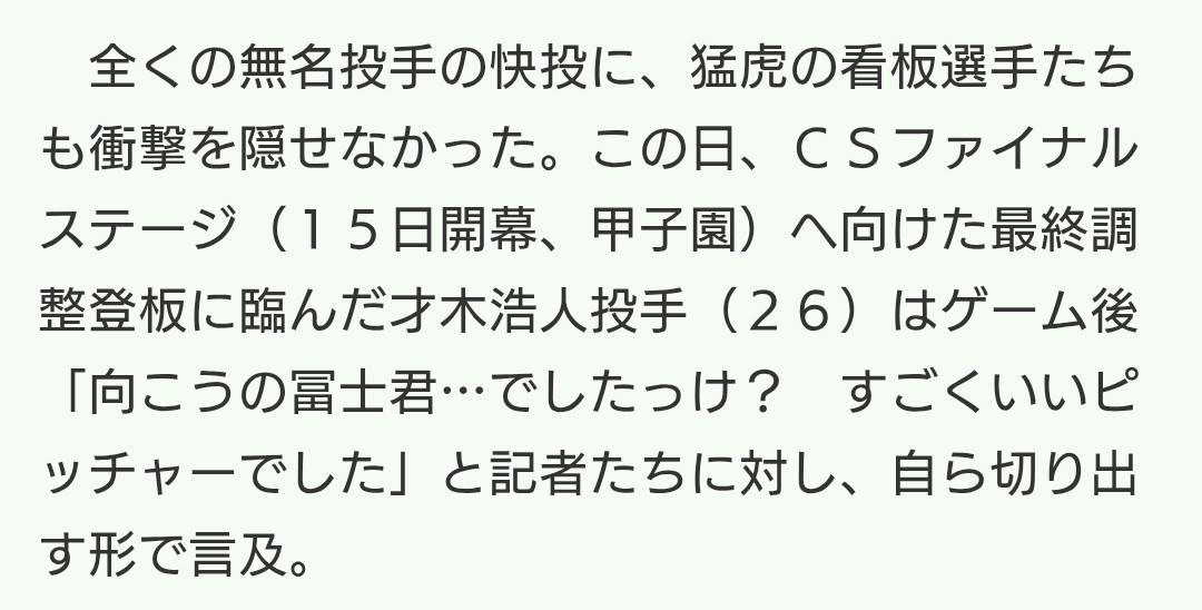 CSに向かう阪神打線を抑えた冨士大和投手を、虎戦士達もベタ褒めです。