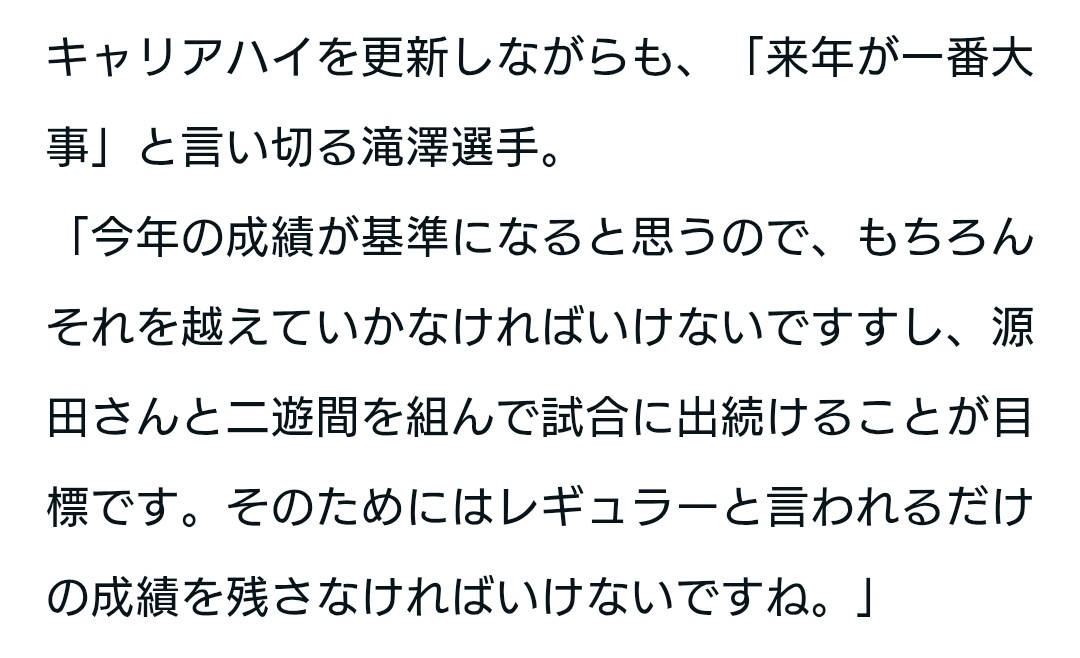 多分、もう源田選手は滝澤選手をただの後輩ではなくライバルとして見ていると思いますので、滝澤選手もそれに相応しい選手へと来季も成長を見せたいです。