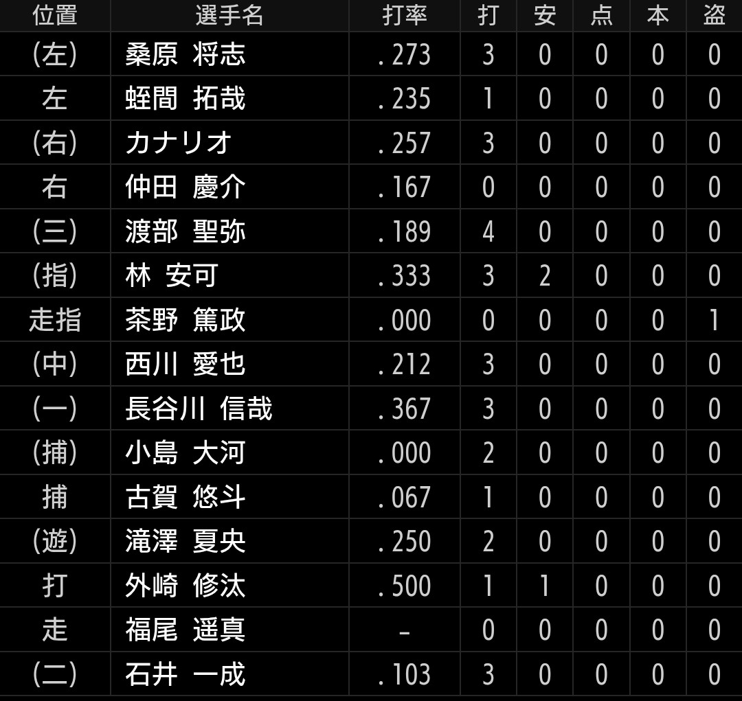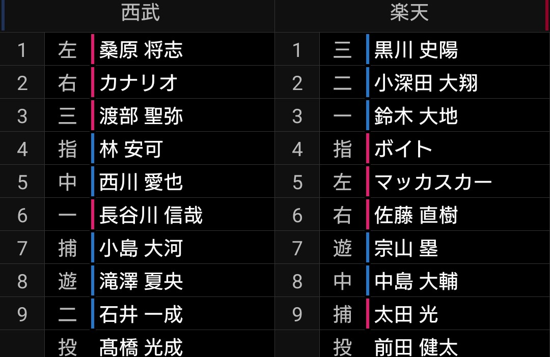 ただ、ネビン選手不在のため、カナリオ、林安可選手の両新外国人選手が1軍となりそうですので、少しでも打席を与えたい思惑を感じる今日の打線です。