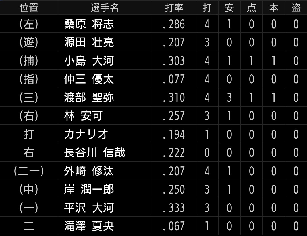 ヒットにこそならなかったですが小島選手はその後の打席も良い当たりを放っていましたし、桑原選手は塁には出てくれるのですが、、、