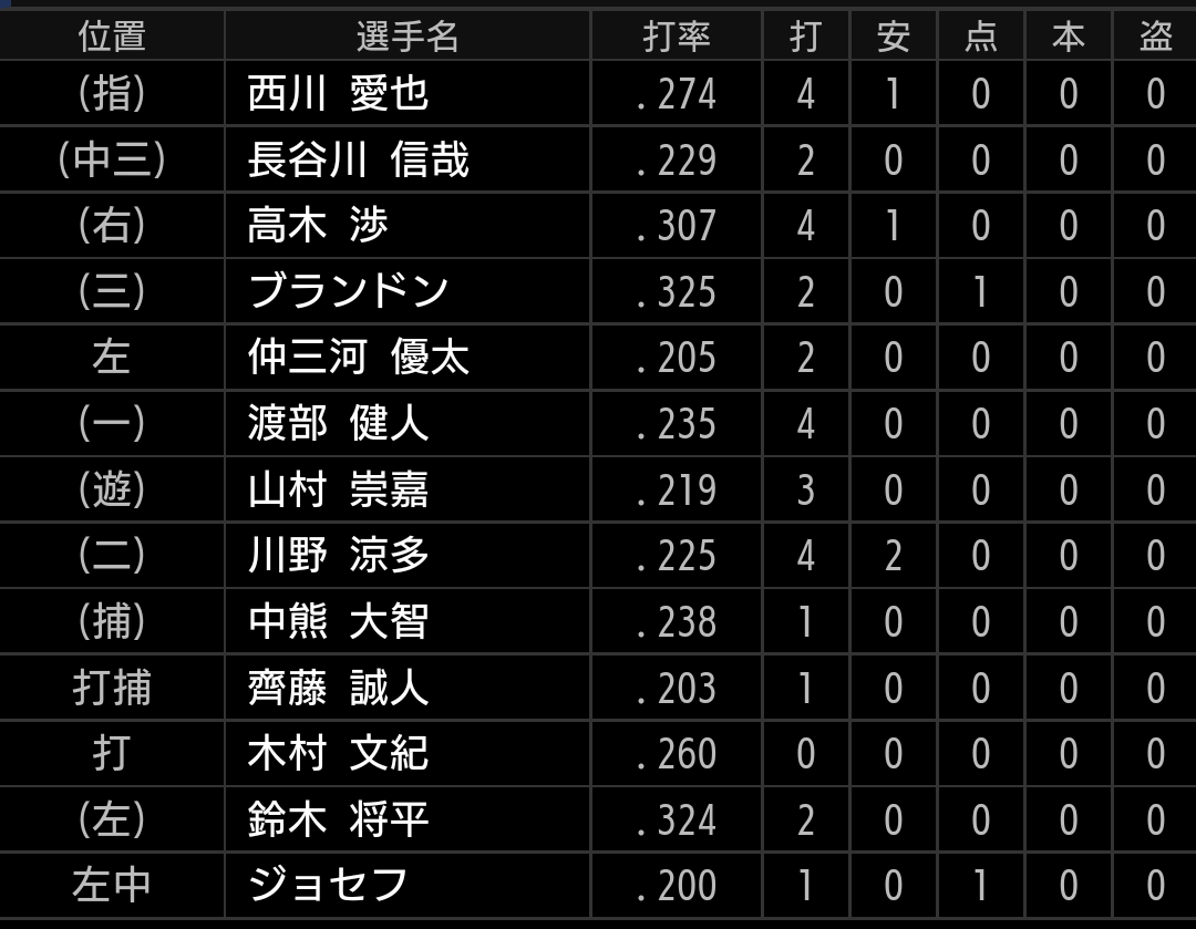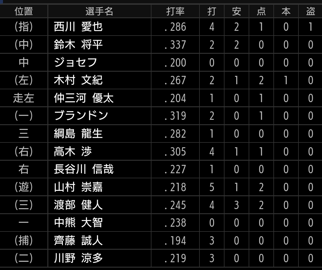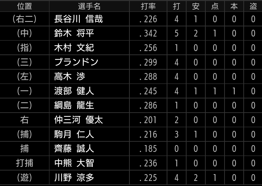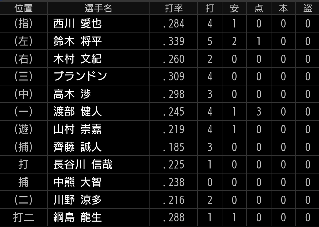 川野は今季の飛躍が期待された選手ですが、今季はここまで苦しんでいます。ルーキー山村がショートを守る事が増えましたが、負けずに頑張りたいです。渡部に今季14号となる、ソロホームランが出ています。
