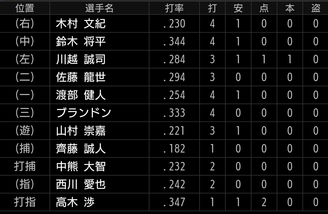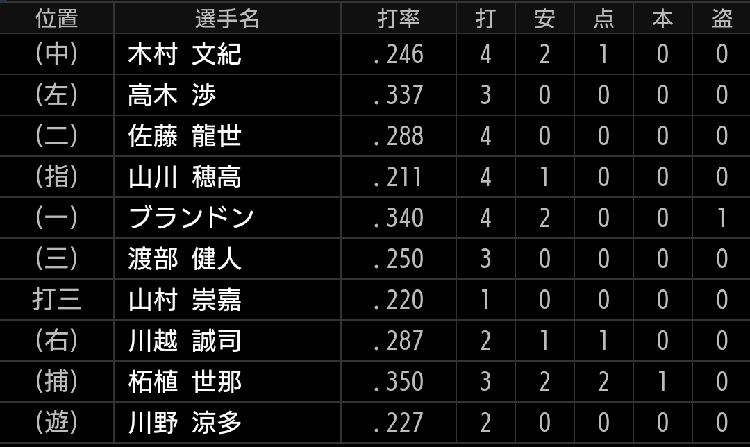 打ち取った当たりが、ボテボテ過ぎてヒットになったり、長谷川と高木渉のお見合いでヒットになったりしましたが、犠牲フライの1点に抑えました。【野手】