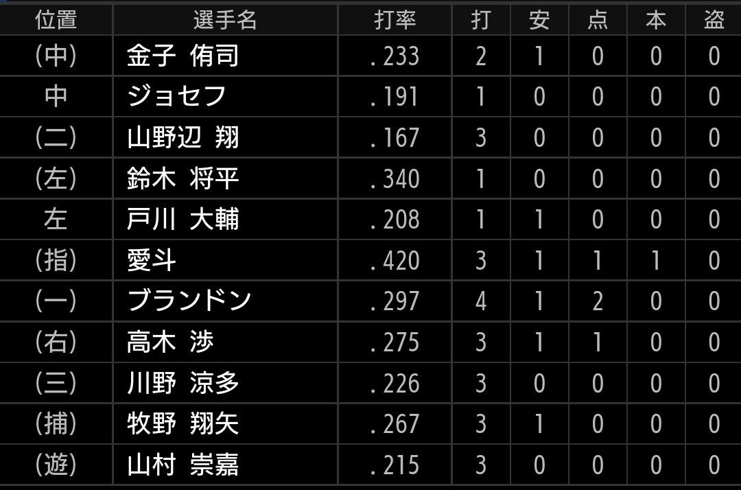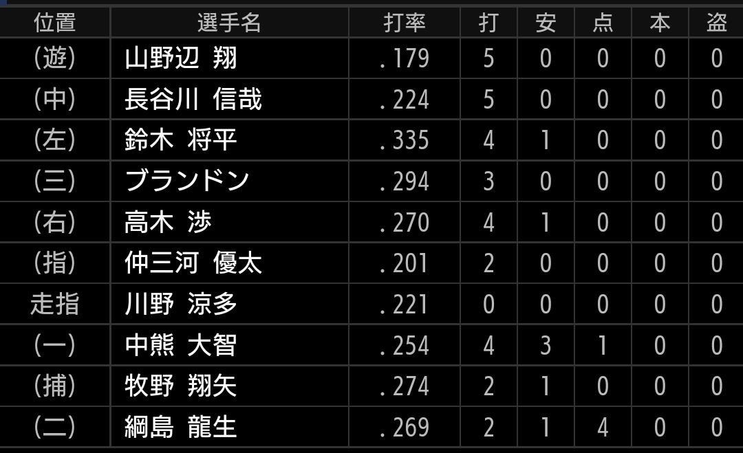 わずか4球で抑えました。最近のファームは、大曲、井上の勝ちパが確立していますね。【野手】