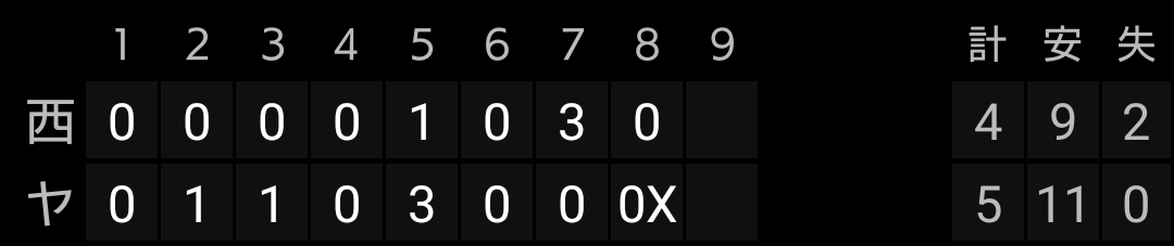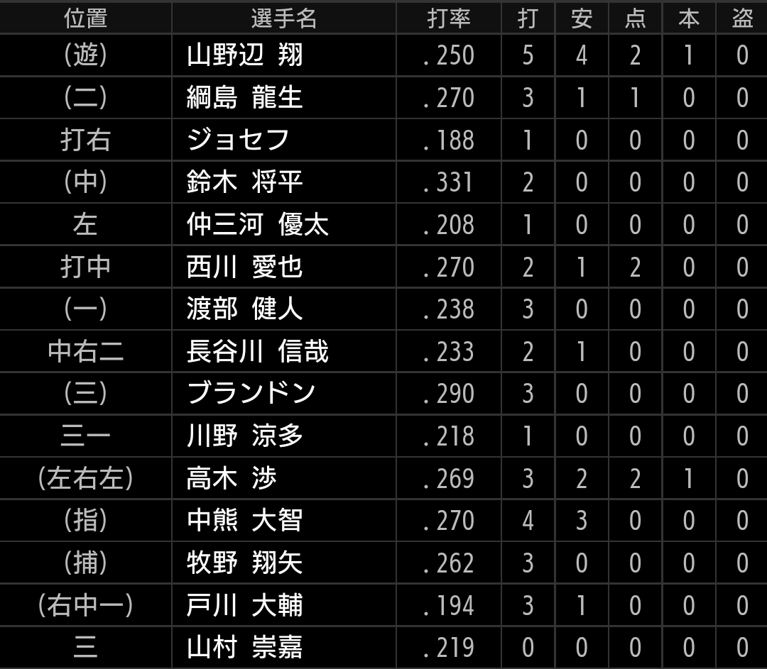 戦列を離れていた西川も復帰しました。2打席目に早速タイムリーを放っています。