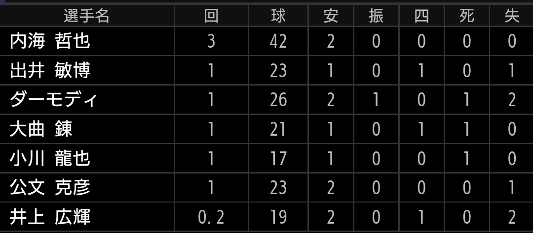 連打されましたが、無失点で切り抜けました。今日は比較的ゾーン内に集められました。今季は制球に苦しみましたが、球の力はあり、空振りも取れる投手ですので、来季は中継ぎの柱になってもらいたいです。大曲