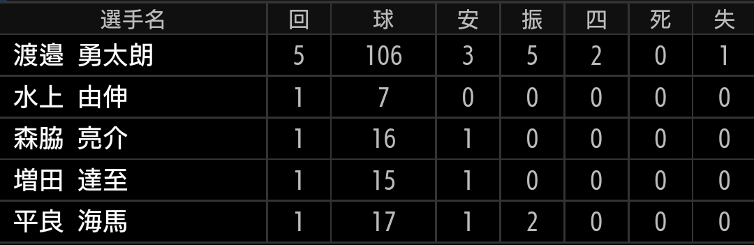 宗に3塁打を浴び、その後はツーアウトまでは取りますが、杉本に四球を出し降板です。武隈