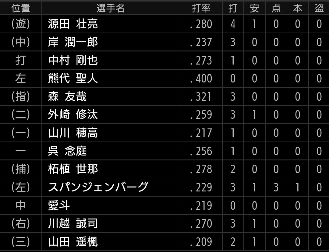 個人的な理想は、外崎、源田、森の並びですが、今は貧打ですので、比較的打っている源田、森を1、2でくっつけたのは良いと思います。今季は長打が少なく、OPS的には物足りない栗山を3番にしましたが、9月は良く打ってますので期待したいです。