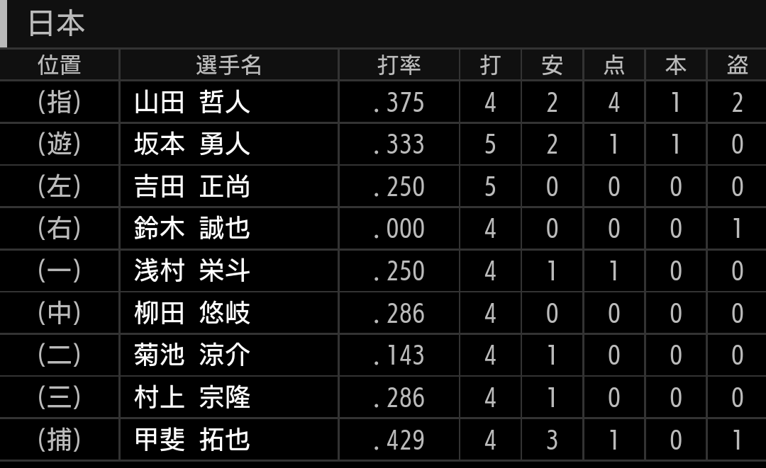 決勝では、ソフトバンクのマルティネス相手に苦戦しましたが、村上のホームラン、吉田正尚のタイムリーで点を取り、投手陣が素晴らしい投球をして、2対0で勝利しました。