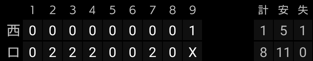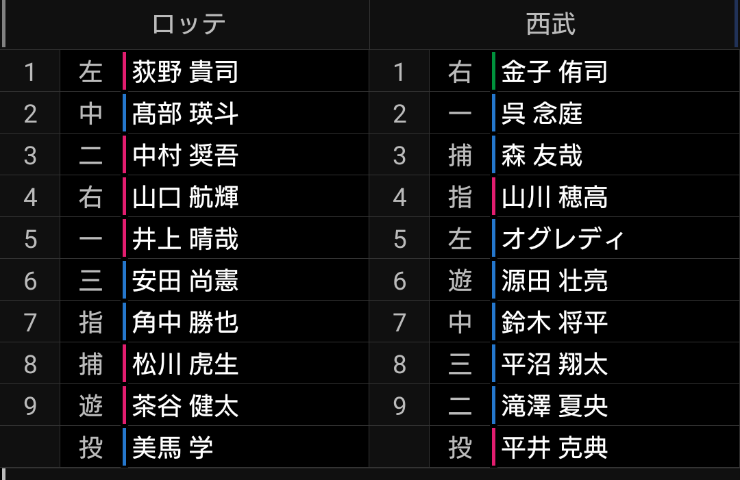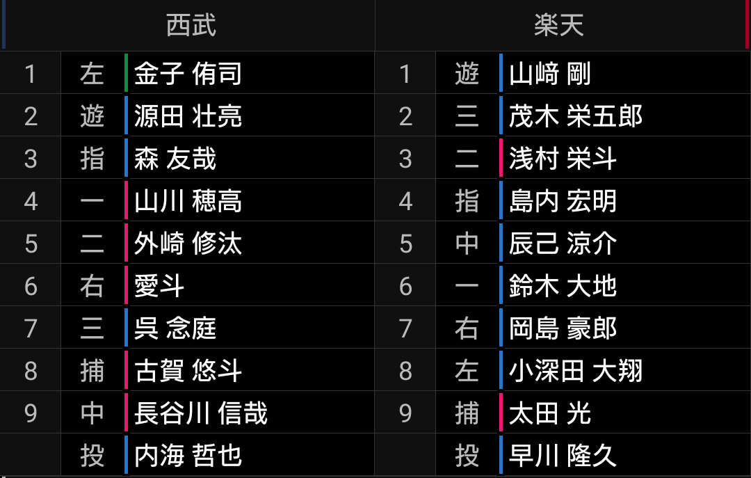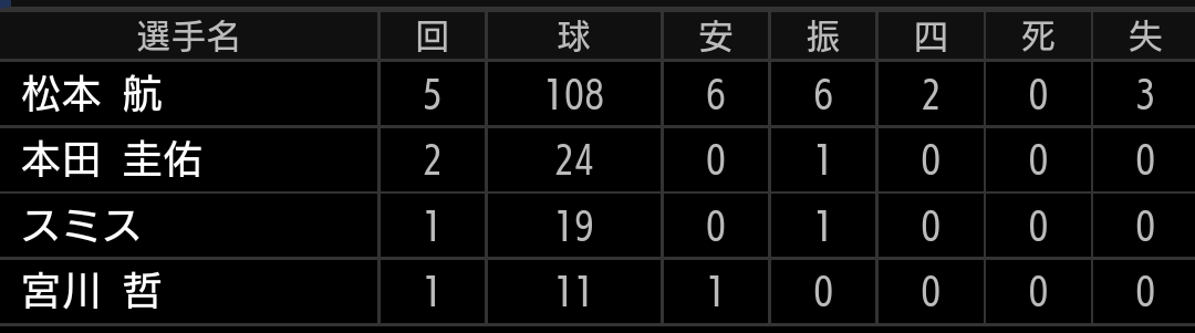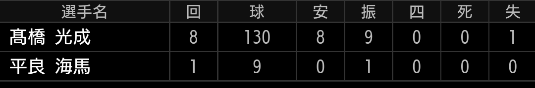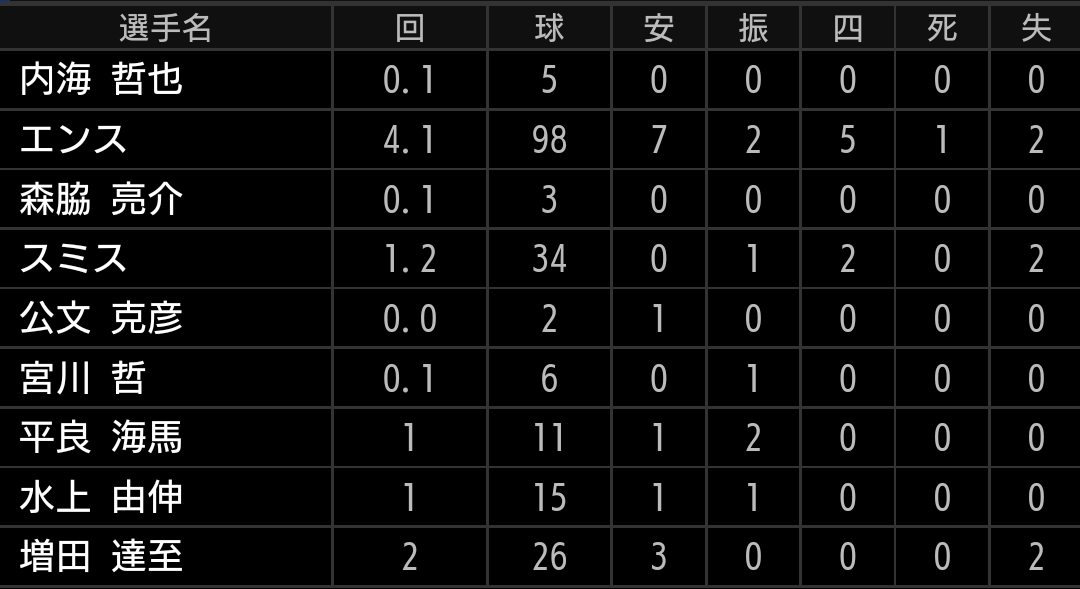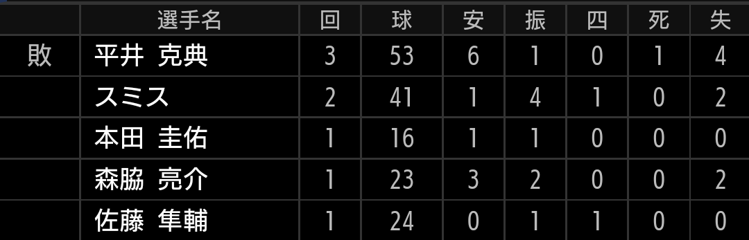 森選手はよっぽどの事がなければ代えませんし、辻監督は投手に比べて野手はあまり交代させないので、捕手3人体制を崩して投手をベンチ入りさせたのは良いと思います。今更ですが、ライオンズは森選手がいるので捕手3人体制に拘りすぎず、出来れば投手が疲労で困っていたときに、こういう采配をしてもらいたかったです。【結果】
