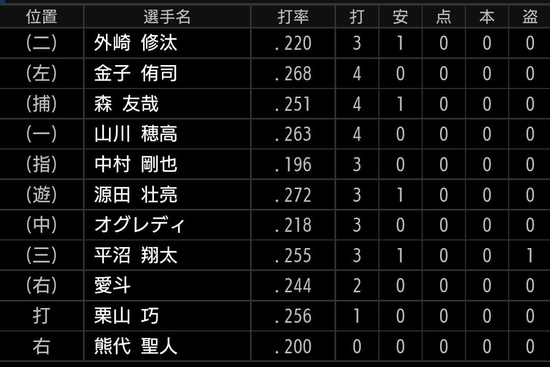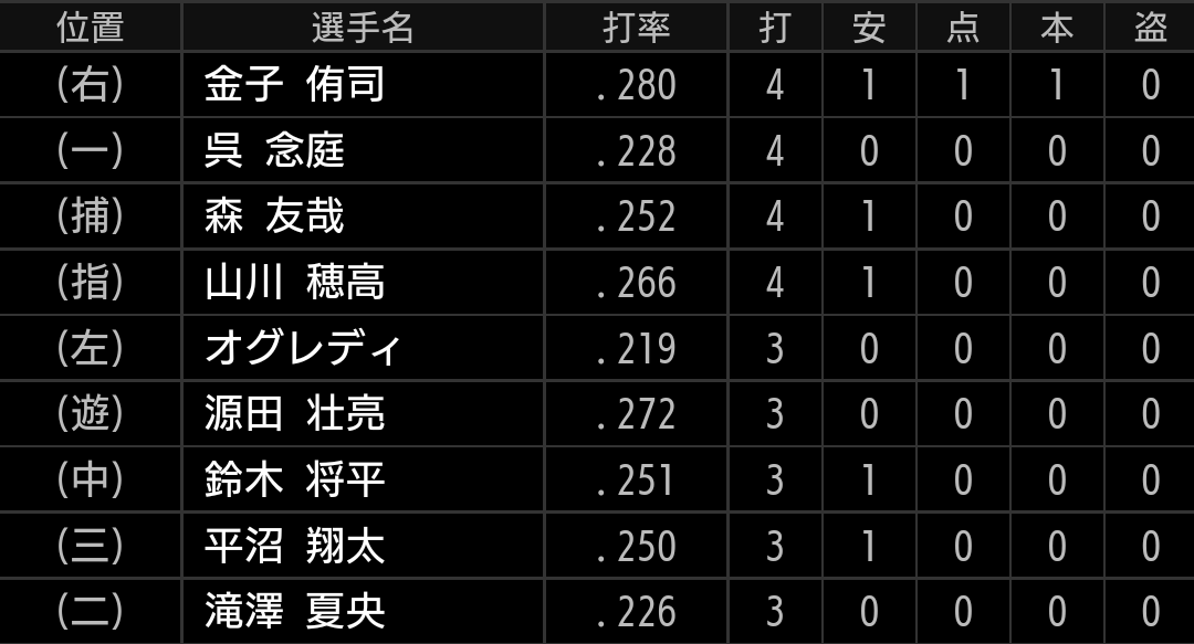 3塁ベースに当たるラッキーなタイムリーでした。打線復活とまでは言えませんが、金子選手2安打、山川選手が3安打と、上位打線が機能したのが得点に繋がりました。エースが8回1失点、4番が3安打1打点とチームを助け、連敗を止めました。
