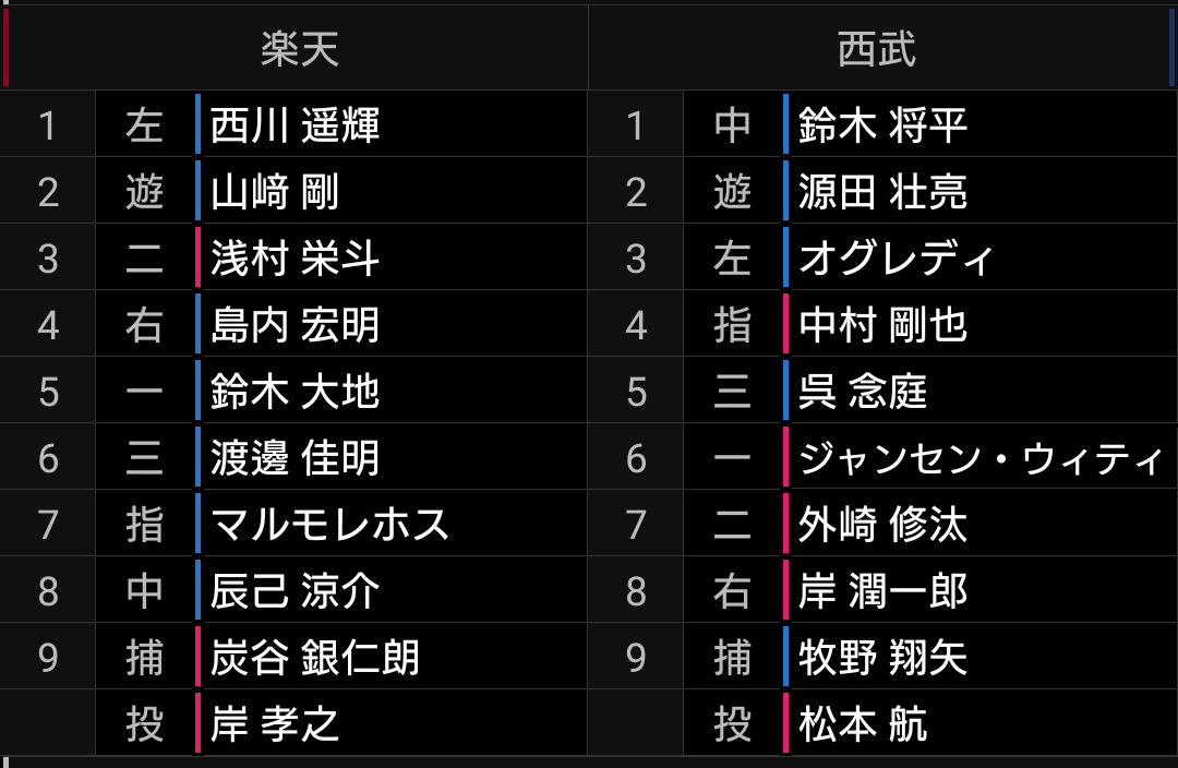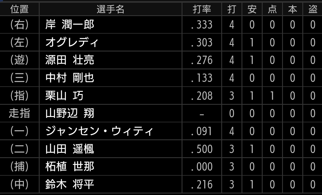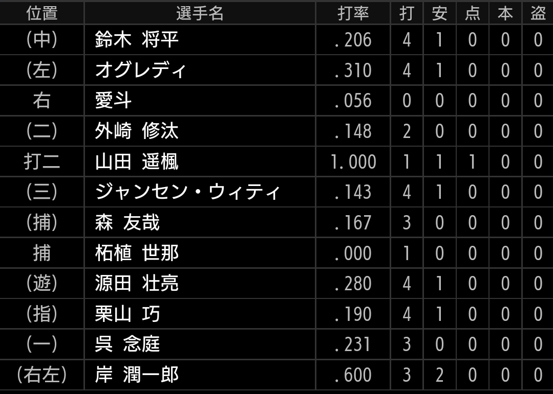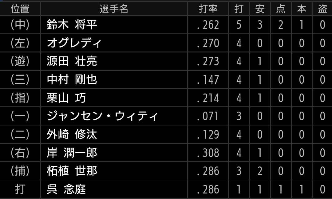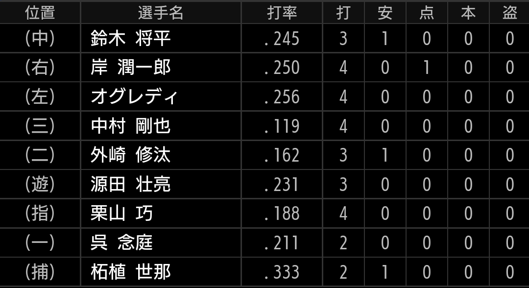 個人的には1番鈴木、2番岸、3番オグレディ、4番呉の打線でもと思いましたが、チームは6連敗と苦しい状況ですし起用された以上、中村選手のチームを救う打撃を期待したいです。
